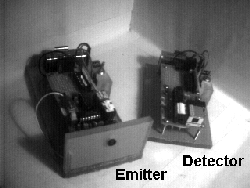 The opening photo shows the emitter-detector pair. They were mounted on plexiglass, but of course, you can custom design your own mounts and enclosures. A combination of soldering and wirewrapping on a Radio Shack breadboard was used. A 9 V battery with a 5 V 7805 regulator and toggle switch was also mounted to give the circuits sturdiness with a clean look. Again you might have your own ideas. Table 1 lists parts needed for the emitter. Table 2 lists parts for the detector. Optional parts are listed. Also, note some of the resistors are not standard. You can either specially purchase them (e.g. Jameco) or just combine resistors in series to add up to the necessary values.