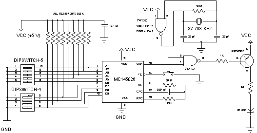 Figure 1 is the emitter wiring schematic. It uses Motorola's MC145026 encoder chip. It encodes 9 bits of information and serially transmits this information whenever TE (Transmit Enable pin 14) goes low. This happens when you hold the pushbutton down. This then pulses the infrared LED at the crystal frequency of 32.768 kHz. The 9-bits are broken down as follows. The first 5-bits (lines A1-A5, pins 1 to 5) represent the address. The next 4-bits (lines D6-D9, pins 6, 7, 9, 10) represent the data. To avoid faulty transmissions, the MC145026 transmits each bit twice.