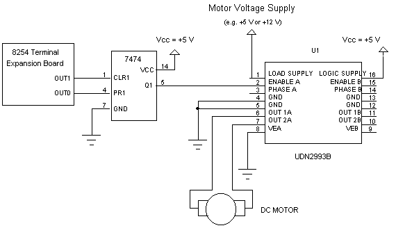 Figure 1 (right) is a photo of the motor and UDN2993 board. The motor has a black disk mounted on its shaft. I milled/drilled a nice motor stand from plastic to hold the motor. The black disk has one small pencil-sized diameter hole, and works as a simple optical encoder disk. The infrared (IR) encoder/decoder tutorial shows how you can construct your own encoder. The 8254 Timer/counter card can be used to count motor revolutions. This will be explained in a future tutorial.