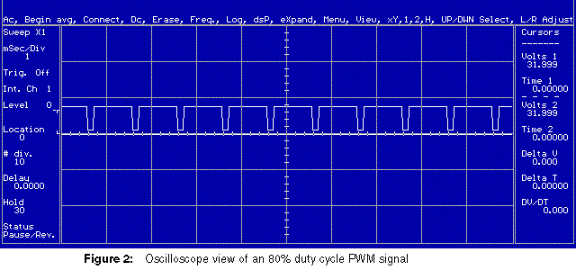 Check your circuit before you physically connect your motor up to the third board. If you have an oscilloscope, you can see the PWM signal by executing the code in the Programming section. Figure 2 is a GIF screen shot from an oscillosope. The scope was connected to the output of the 7474 flip-flop (pin 5). The 80% duty cycle can be clearly seen. During one period, the signal is high (+5V) 80% of the time and low (0 V) for the other 20%.
