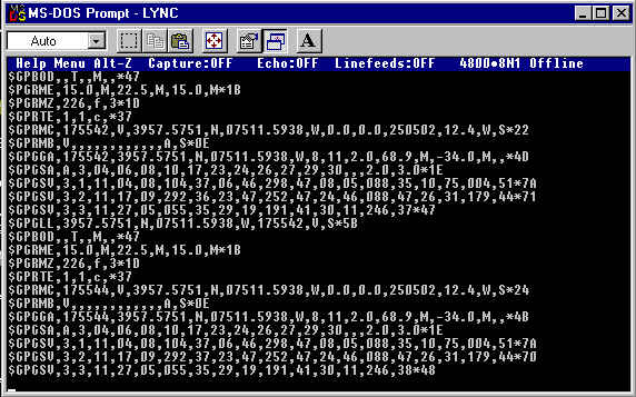 To compile, at the DOS prompt type tcc -ml gps1_5.c ibmcom3.obj. This of course assumes that ibmcom3.obj is in the same directory as gps1_5.c. the -ml option invoke Turbo C's large memory model. Running the executable (gps1_5.exe) will display the UTC time, the Eastern Standard time (EST) equivalent and both latitude and longitude coordinates. Additionally, all message strings output by your GPS receiver are saved into an ASCII file named gpsData.txt.